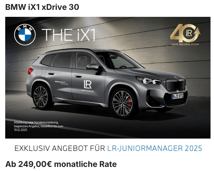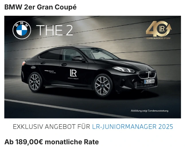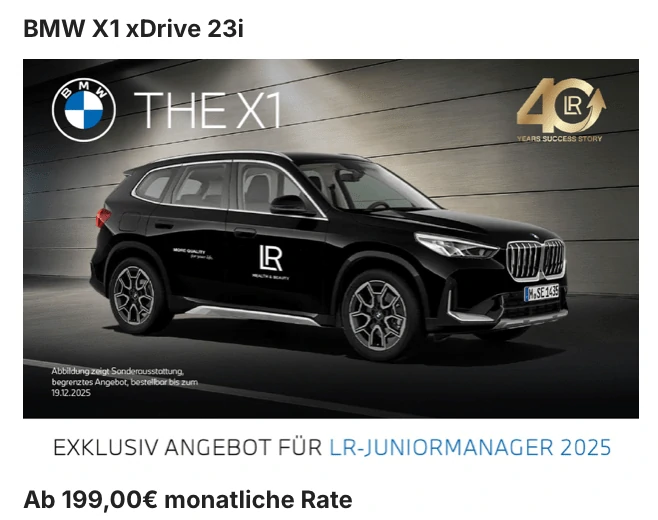 Schon wieder neue unfassbareLeasingkonditionen für LR-Partner ab der Junior-Manager-Qualifikation. Wer gerade überlegt sich einen Neuwagen zu kaufen, zu leasen oder zu finanzieren sollte sich vorher lieber erstmal mit mir unterhalten um sich das LR-CarConcept mal genau erklären zu lassen, Du wirst begeistert sein. Ich kann gut verstehen, wenn Du das alles nicht glauben kannst, aber es funktioniert, über 18000 begeisterte LR Partner fahren aktuell LR-Firmenwagen!Stell Dir das mal vor! So viele Menschen können sich nicht irren! Information schadet nur dem der sie nicht hat!